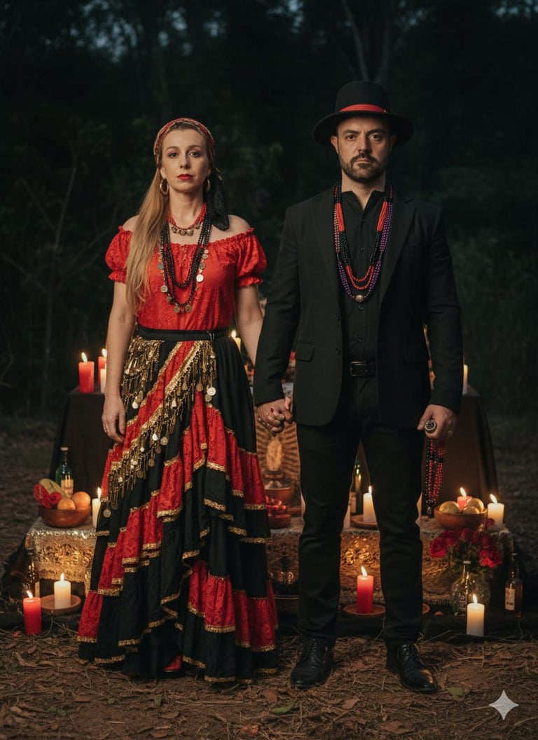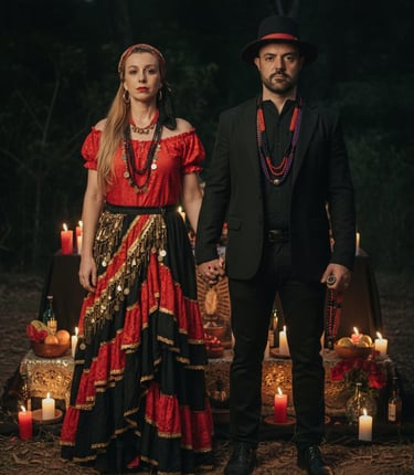 Durante anos, viajaram por todo o Brasil com as Danças Ciganas, levando arte, cultura e beleza a palcos, eventos e festivais. Ministraram aulas, workshops, shows, foram jurados em competições e organizaram algumas das maiores Feiras Místicas e Noites Ciganas do país. Foi nesse chão da arte e da estrada que nasceu o nome Casal Coimbra — uma identidade que hoje pulsa em cada projeto, ritual e espaço que constroem juntos, seja na espiritualidade, nas terapias ou nas cerimônias xamânicas.